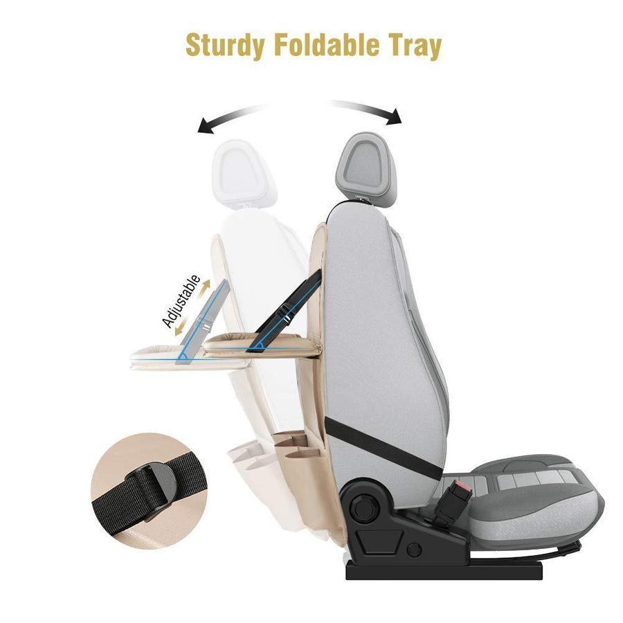 - 🚗【STURDY FOLDABLE TRAY】--- Foldable dining table can be put down as dining table and also as a work desk to hold your tablet. Made of hard board, bear up to 3.3kg items. This fantastic car organizer will bring you and your family one comfortable and tidy car trip.